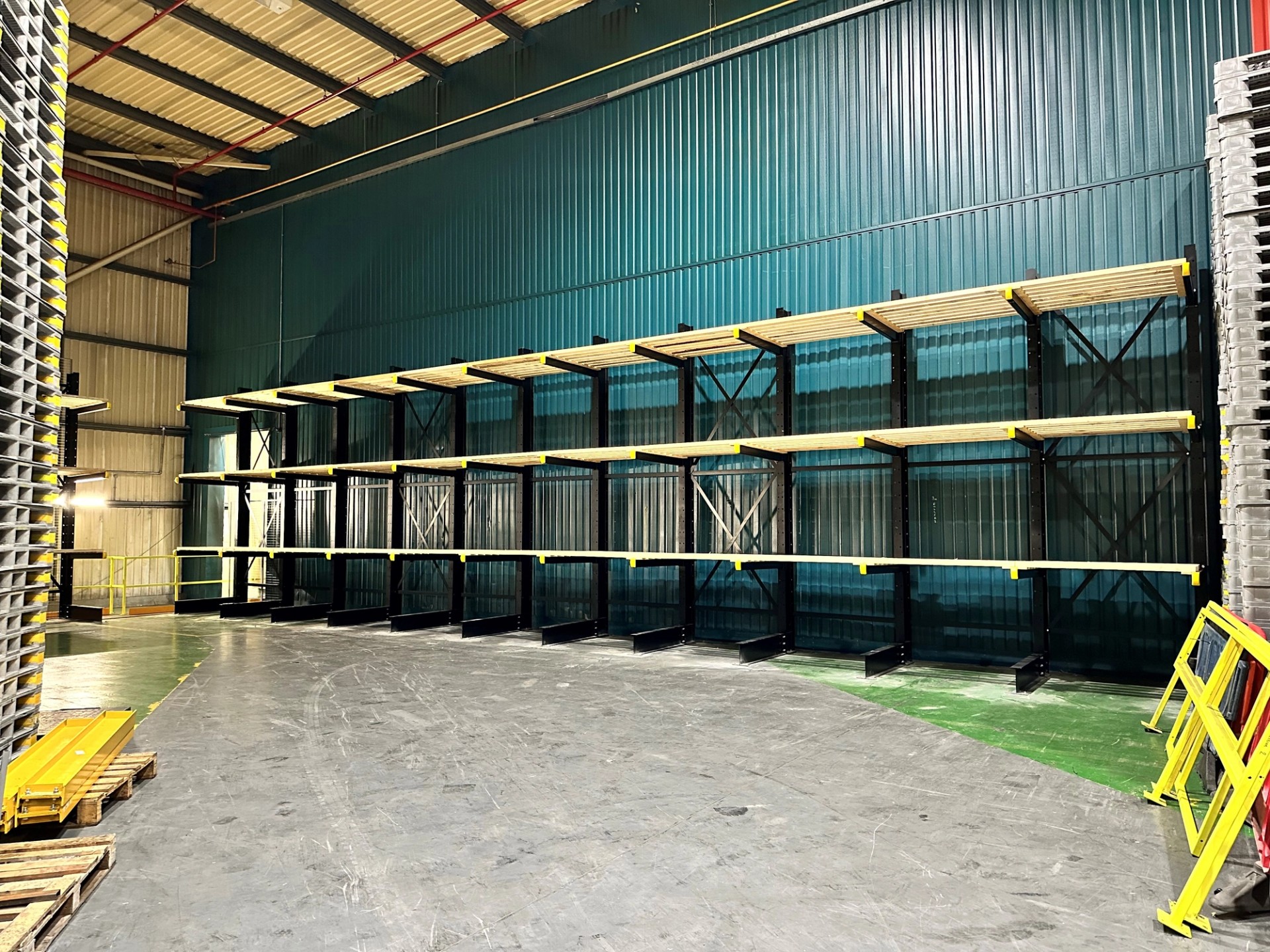 With irregular sized pallets being stored, we designed our cantilever system to suit their varying sizes of industrial equipment in their clear working space to give more storage capacity.