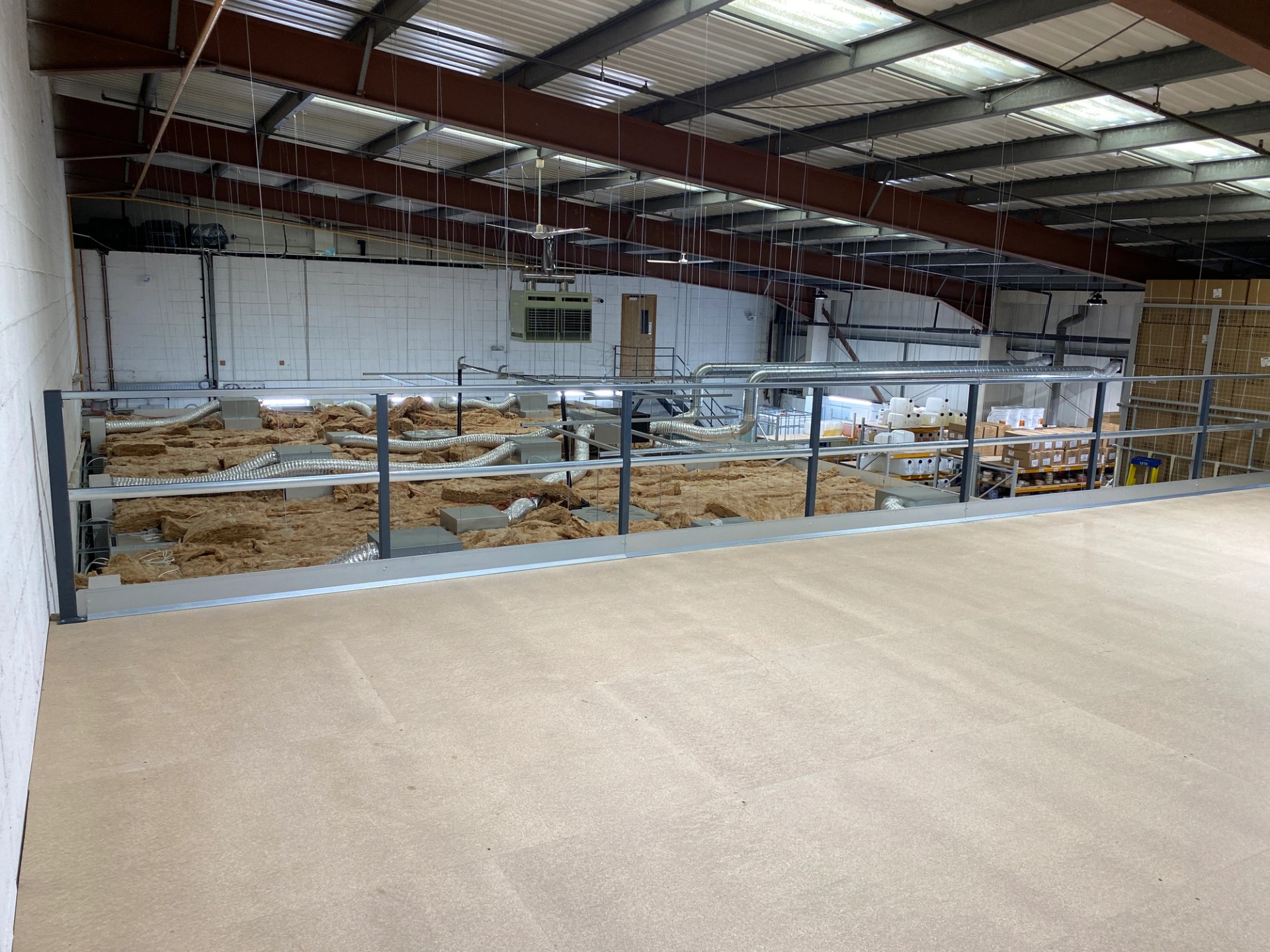 Installing the mezzanine floor and fire rating which match the existing finished floor height of the existing mezzanine floor on site (also installed by Storage Concepts) gave the client a big open plan 1st floor working area for their additional storage and packing area within their existing premises rather than moving to a new premises. By fire rating the floor to comply with building regulations, this allows the client to carry out their first floor operations to the latest compliance requirements.