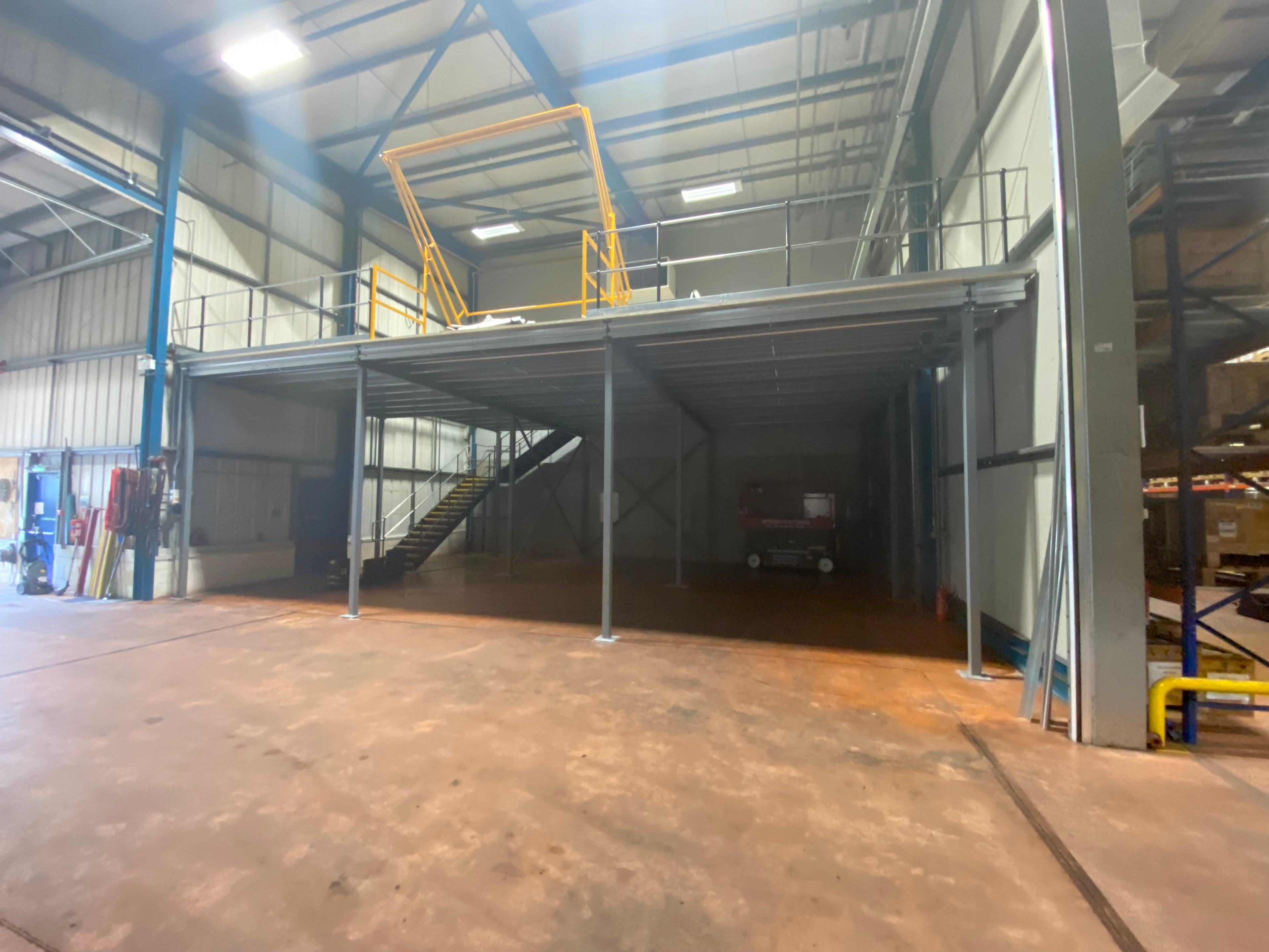 The columns are then checked to ensure they are plumb and then cross bracing is installed to give the structure it’s required design strength. The columns are then bolted to the floor. All the above installation is carried out via mobile scaffold towers. The installation team will then start installing the mezzanine flooring material which is normally 38 mm thick tongue and grooved particle board.