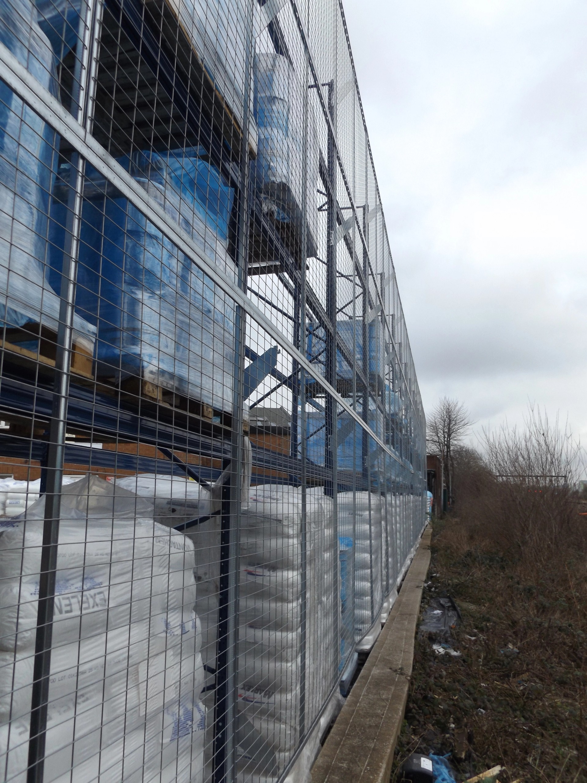 The yard has a railway embankment on one of its demises. The client wanted one of the runs To be situated along this demise. To make this safer we installed anti-collapse mesh to the back of this run. This will stop any stock potentially falling through the back of the racking due to poor loading and falling on to the embankment.
