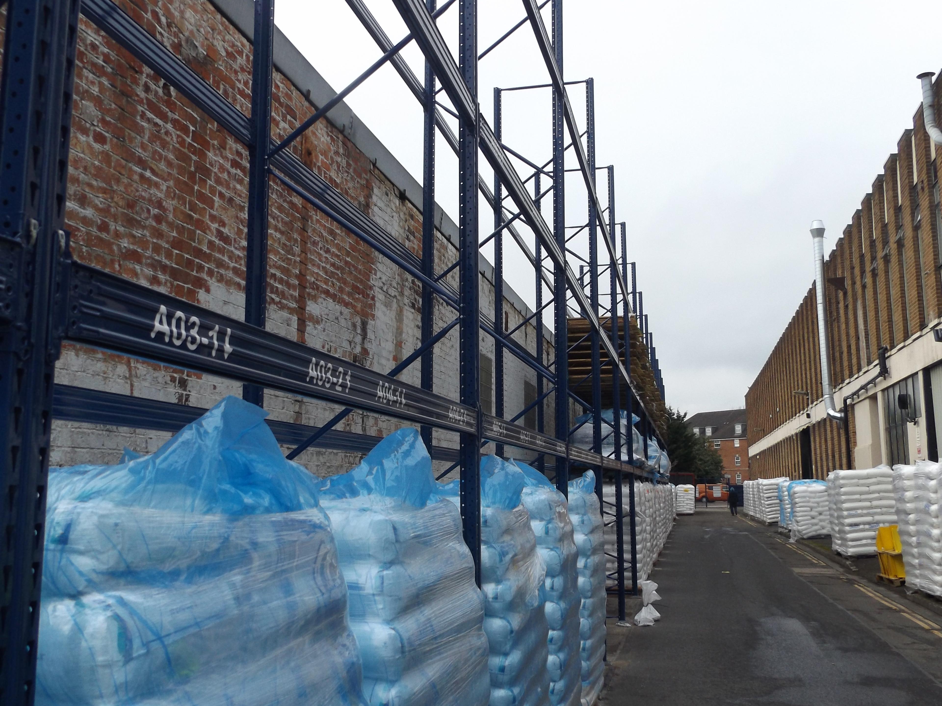 External pallet racking and concrete pads installed in Derby including anti-collapse mesh and painted in Reform's company colours.