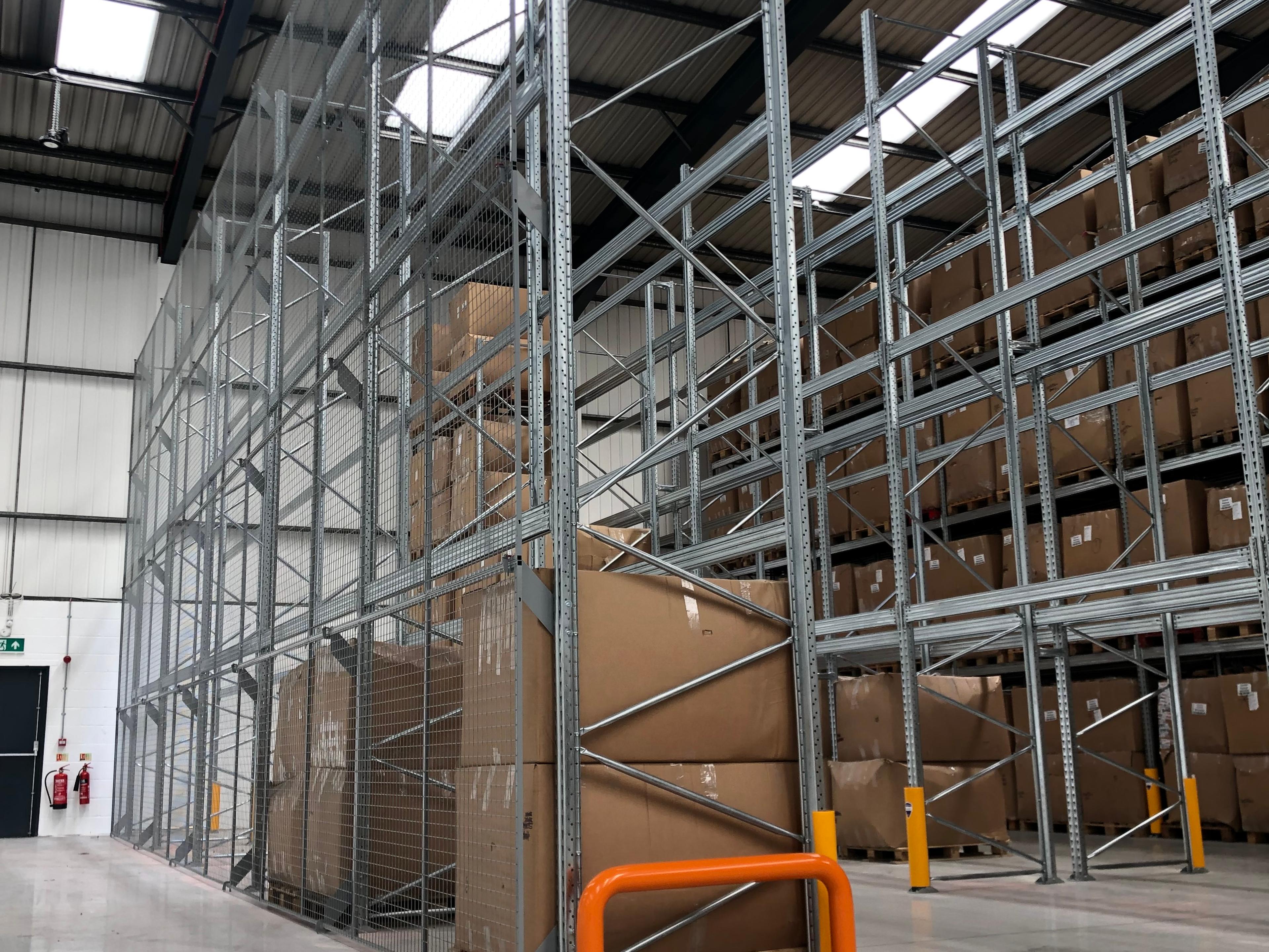The pallet racking was fitted with anti collapse mesh to provide a protective barrier from personnel above and below the mezzanine from plant operating in the racking.